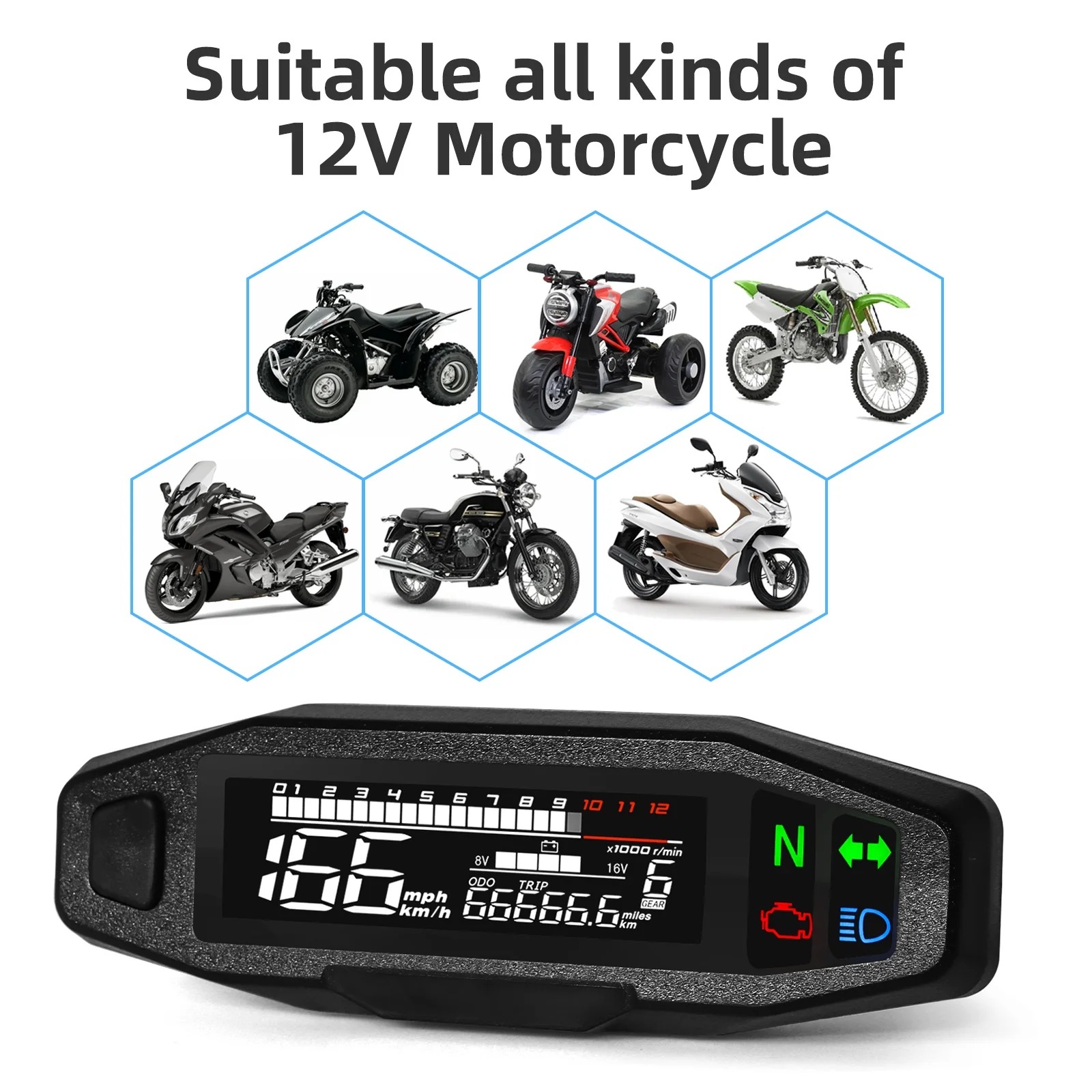 4.Multifunzionalità avanzata: progettato come una soluzione completa per gli appassionati di motociclismo, questo display del contatore funge da chilometro, velocimetro e tachimetro,che consente di monitorare più metriche vitali contemporaneamente.